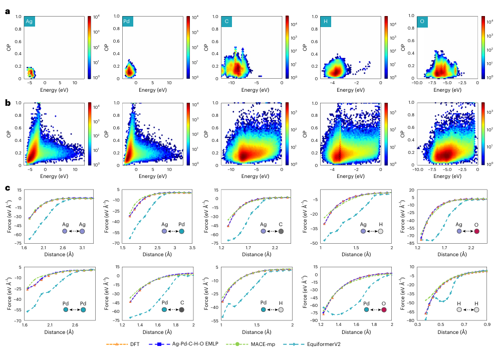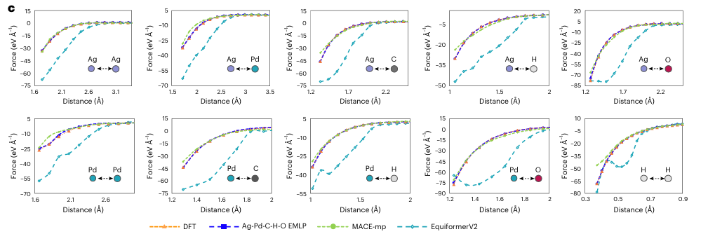 图2c展示了EMLP对十种二聚体(如Ag–Ag, Pd–C, C–H等)相互作用力的预测结果。EMLP与DFT高度一致,而MACE-mp、EquiformerV2和M3GNet均出现明显偏差,尤其在短距离排斥区域。