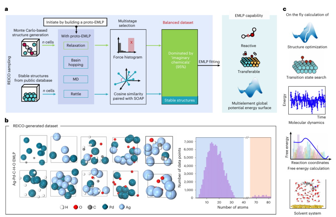 在这一背景下,上海科技大学Hu课题组开发了一种基于元素的机器学习势函数(Element-based Machine Learning Potential, EMLP),通过创新的随机探索虚拟化学优化(REICO)采样策略,实现了对多元催化体系的精确描述。