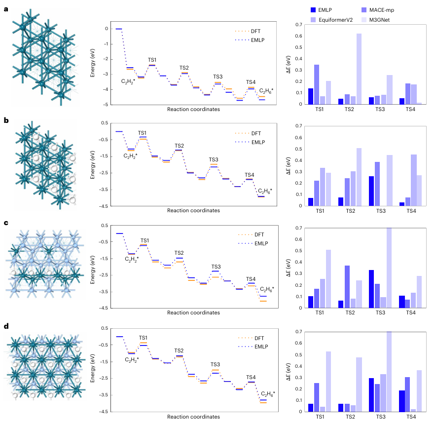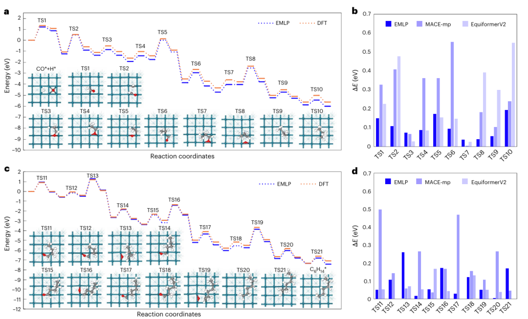 EMLP在所有体系中均表现出色,反应能垒(Eₐ)和反应焓变(ΔE)的MAE均低于0.15 eV