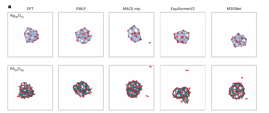 只有EMLP能够稳定模拟团簇结构,未出现O₂分子脱离等非物理现象,而其他模型则出现结构崩塌。。
