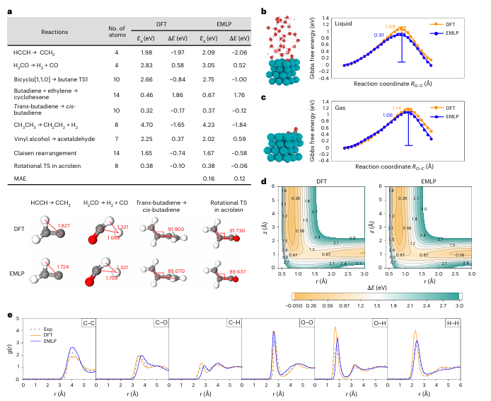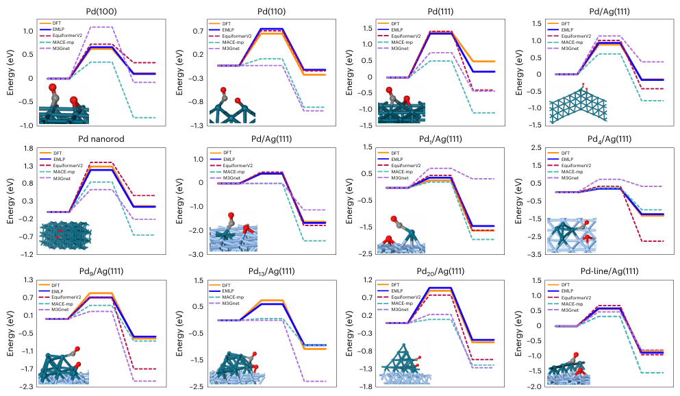 与传统MLP相比,EMLP的最大创新在于其真正的通用性。该方法不依赖于特定的结构或反应路径输入,而是通过元素级别的描述符实现跨体系的适用性。这种设计使得同一个势函数可以应用于不同的催化体系和反应类型。