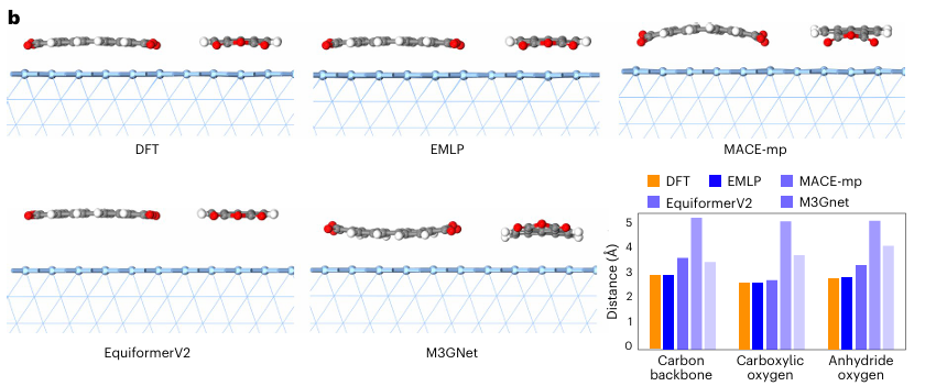图3b展示了PTCDA分子在Ag(111)表面的吸附结构 relaxation 结果。EMLP准确复现了DFT的结构与吸附距离,而其他模型出现分子弯曲或距离偏差。