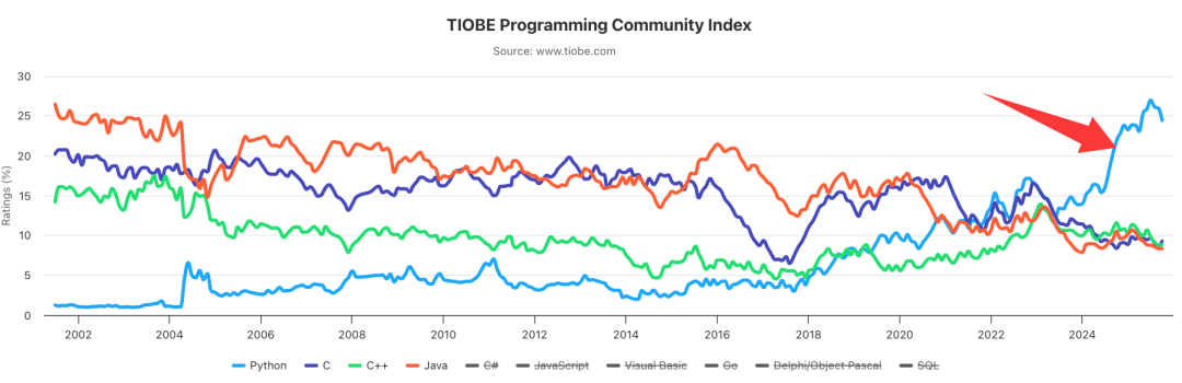 本月,C 能够重新拿下第二名,主要得益于 C23 标准的发布和应用带来的推动力。不过,Java 刚刚推出了 Java 25 版本,而 C++ 也正在紧锣密鼓地准备 C++26,所以第二名之争还会很激烈。因此,在它们三个中,目前还无法判断,究竟哪一门语言能最终占据上风。这几年 C、C++、Java 的走势都是稳中有降,而那掉下去的热度、关注度,全被 Python 给吃了。