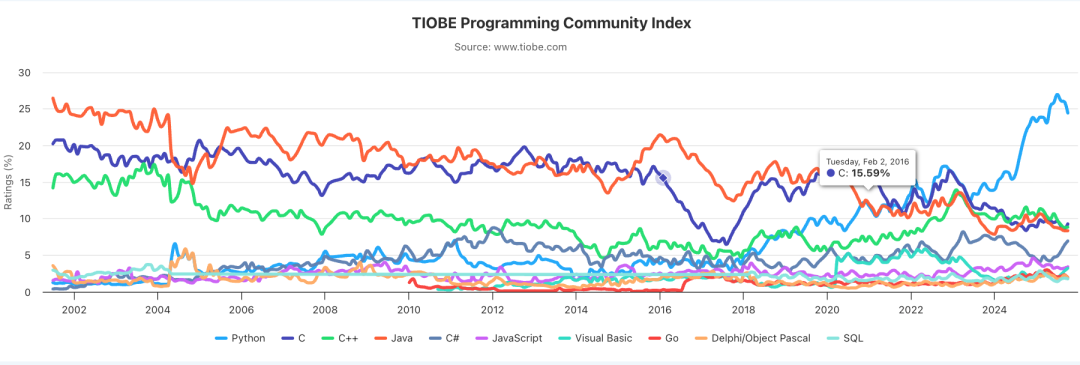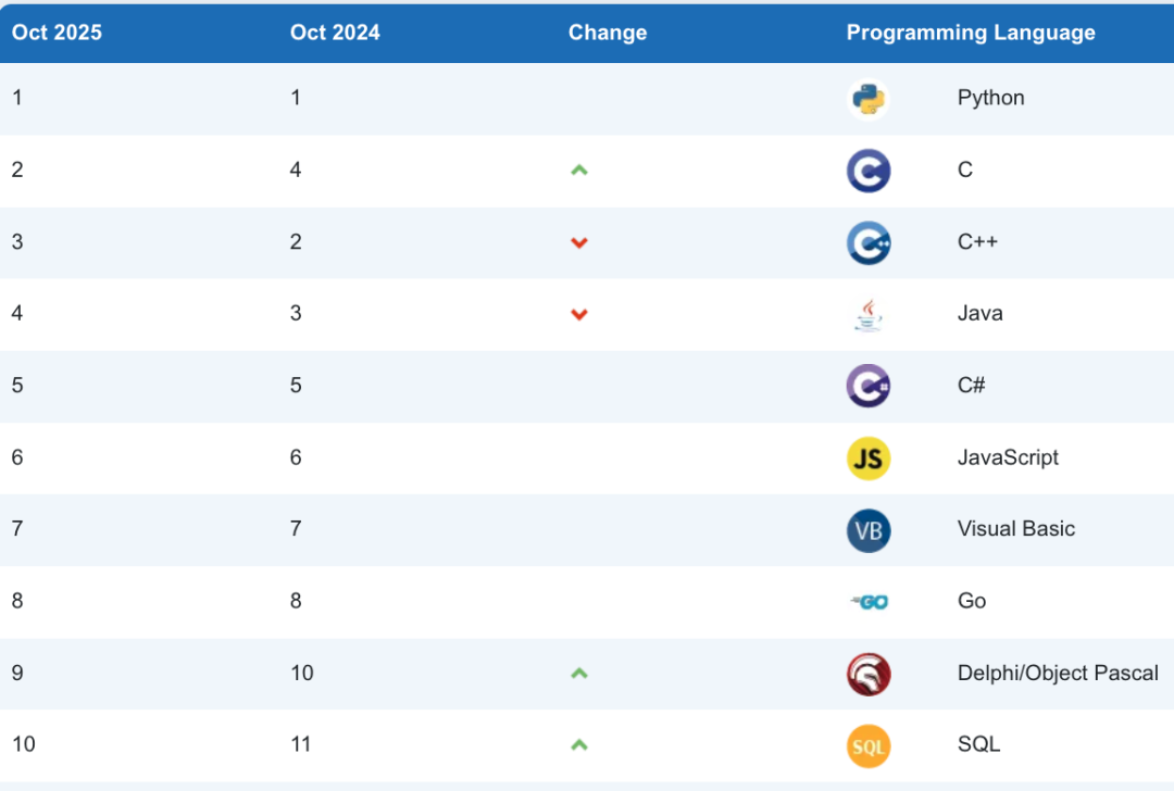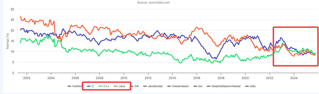 TIOBE 2025 年 10 月份的编程语言排行榜已经公布,官方的标题是:第二名之争愈演愈烈(The fierce battle for second place in the TIOBE index)!自从 2023 年末 Python 拿下 TIOBE 第一名后,就没下来过。而在它身后 C、C++ 和 Java 一直在为第二名的位置展开激烈竞争。过去一年多,这三门语言之间的排名差距始终不足 1%,有时是 C 领先,有时是 C++ 反超,而如今 C 再次回到了第二名的位置,Java 则始终紧随其后,从未掉队。C、C++、Java 能持续存在的,关键在于他们有自身的优势:C 是底层语言的老祖宗,速度快、效率高。