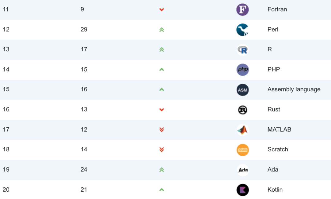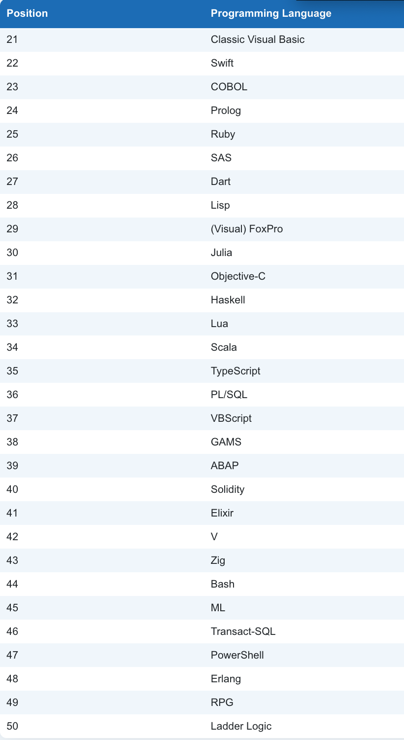 ActionScript, Algol, Apex, Awk, B4X, Caml, CLIPS, Clojure, D, Elm, F#, Forth, Groovy, Hack, Icon, Inform, Io, J, JScript, LabVIEW, Logo, Modula-2, Mojo, MQL5, NATURAL, Nim, OCaml, Occam, OpenCL, OpenEdge ABL, PL/I, Q, Raku, REXX, S, Scheme, Simulink, Small Basic, Smalltalk, SPARK, Stata, Structured Text, SystemVerilog, Tcl, Vala/Genie, VHDL, Wolfram, X++, XC, Xojo。TIOBE 每个月都会公布一次编程语言的排行榜,这份排行榜排名基于全球技术工程师、课程和第三方供应商的数量,其中包括了流行的搜索引擎以及技术社区,如 Google、百度、维基百科等等。