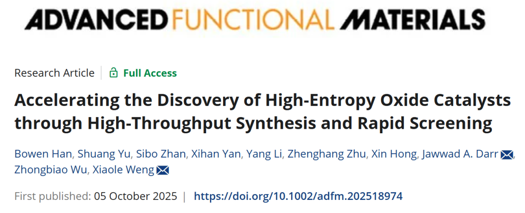 文献信息:Accelerating the Discovery of High‐Entropy Oxide Catalysts through High‐Throughput Synthesis and Rapid Screening. Bowen Han;Shuang Yu;Sibo Zhan;Xihan Yan;Yang Li;Zhenghang Zhu;Xin Hong;Jawwad A Darr;Zhongbiao Wu;Xiaole Weng. ISSN: 1616-301X , 1616-3028; DOI: 10.1002/adfm.202518974. Advanced functional materials. , 2025