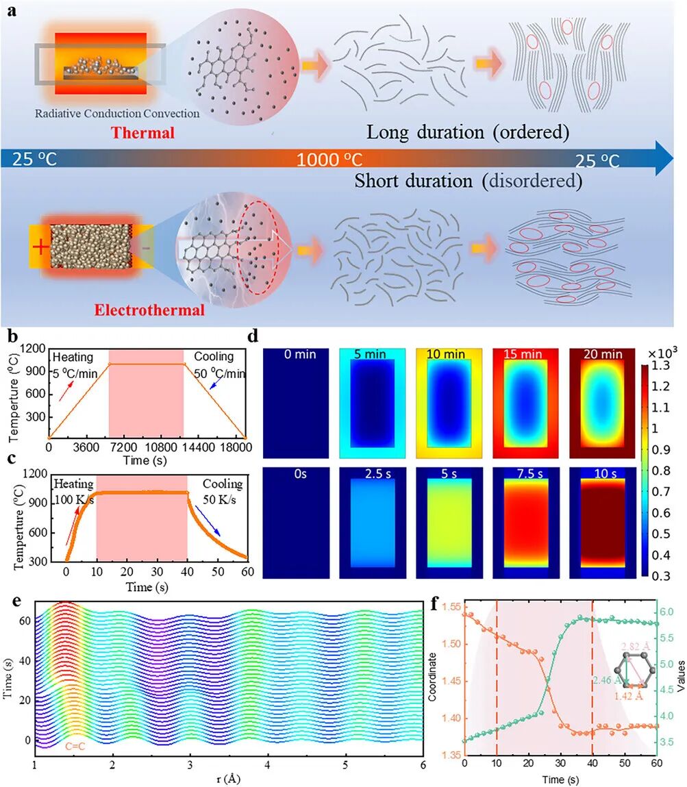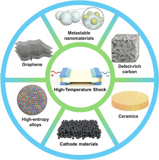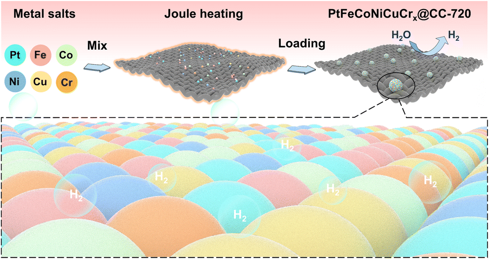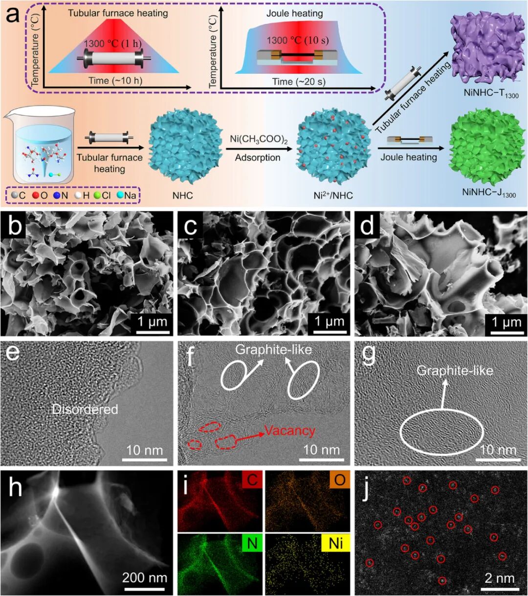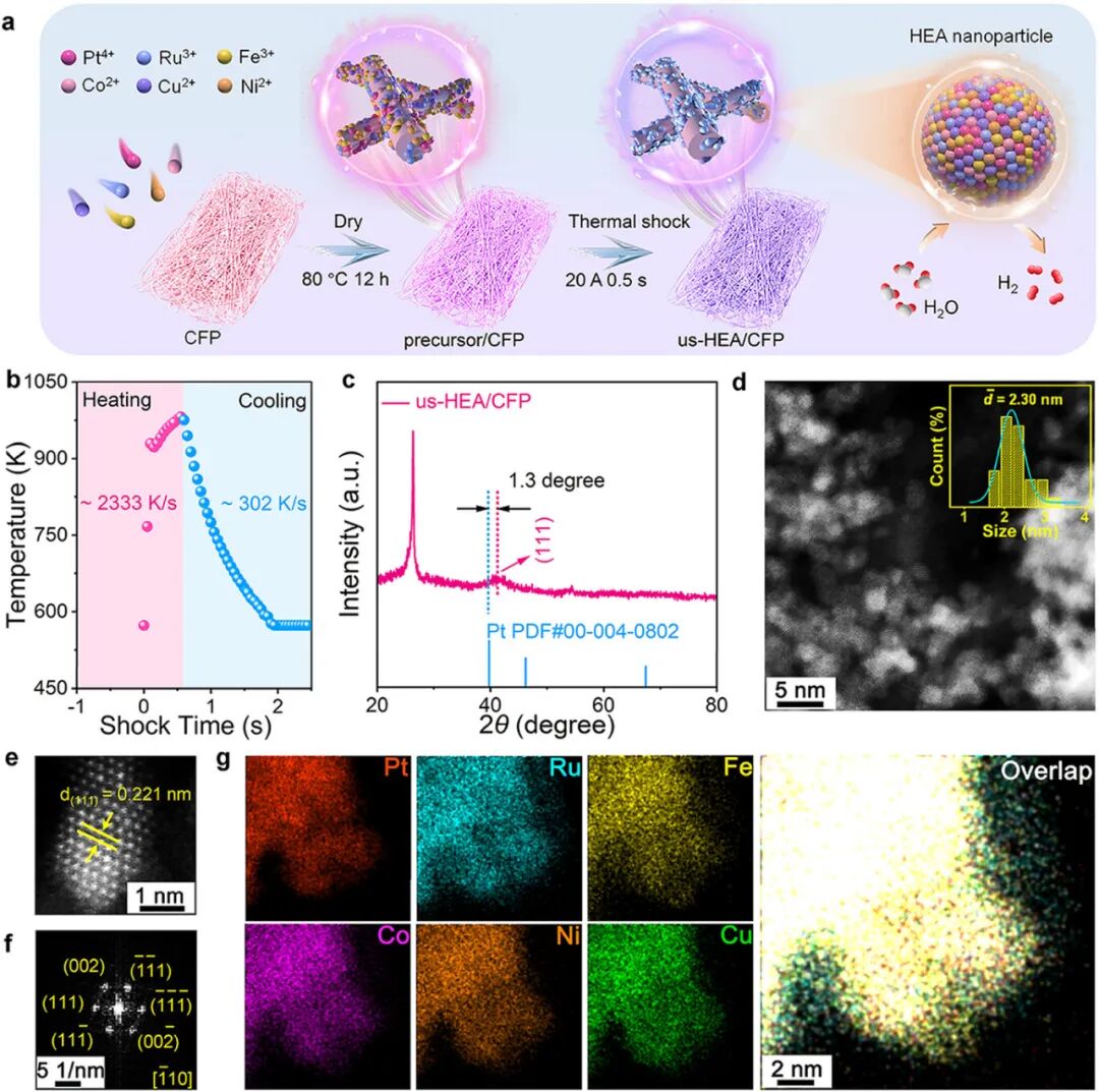图1展示了该一体化工作流程的整体设计,涵盖了从高通量合成、快速催化测试到数据驱动分析的全过程。图中明确呈现了三个核心模块的衔接关系:首先通过连续水热合成系统结合快速热处理实现HEOs的高效制备;随后利用快速焦耳加热系统对催化剂进行瞬时升温与活性评估;最终将获得的催化性能数据与物理化学特征结合,通过机器学习模型进行构效关系解析与性能预测。该流程图系统地体现了平台的高度集成性与自动化特征,为后续大规模材料开发与性能优化提供了可操作的框架。