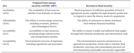 在国家粮食安全评估框架构建上,将能源安全4As框架应用于粮食安全领域,并对其包含的四个维度在粮食安全背景下的定义进行了探讨。本文认为虽然能源和粮食属于不同的领域,但二者在基础性资源地位、高度全球化市场、对价格波动的敏感性以及对环境的外部性影响等方面具备相似属性,这为4As框架的跨学科应用提供了理论支持和实践支撑。