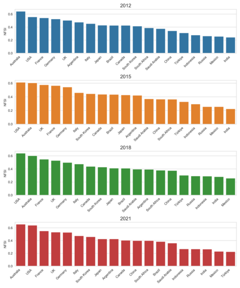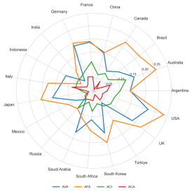 (二)将4As框架应用于G20成员国,发现各国在粮食安全方面呈现出明显的差异化:澳大利亚、美国、法国、英国和德国始终表现出强大而平衡的粮食安全,而印度、墨西哥、俄罗斯和印度尼西亚则面临多重挑战;欧盟成员国在农业可持续性方面有了很大改善,而中国的进步相对较小,巴西在这方面则有所倒退。