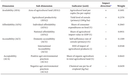 (一)通过德尔菲法确定了4As框架中八个核心指标的权重。结果表明,在决定国家粮食安全水平的各项指标中,农业生产率、粮食可负担性和人均可耕地比其他指标更重要。