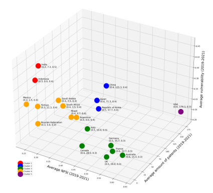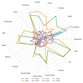 (三)基于机器学习的聚类分析,所有国家被划分为五个特征鲜明的类别,包括领先表现者、韧性表现者、创新表现者、中等表现者与脆弱表现者。具体而言,在G20成员国中,美国以高水平的粮食安全、绿色农业创新和强大的气候适应能力脱颖而出;中国、日本和韩国面临着中等程度的粮食安全和气候脆弱性,但它们在绿色技术方面具有高度的创新性;加拿大、德国、法国、英国、意大利和澳大利亚表现出高度的粮食安全、较低的气候脆弱性和相对较强的绿色创新;其他成员国需要加强可持续农业方面的创新,以改善粮食安全和气候适应能力。