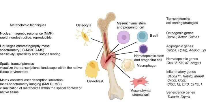 单细胞与空间多组学技术(转录组、代谢组)揭示了骨髓中MSPCs与HSPCs的细胞异质性及其互作,并直接描绘了骨组织中糖酵解、氧化磷酸化等代谢通路的空间分布模式,为理解骨稳态、修复及衰老提供了全新的细胞与分子视角。