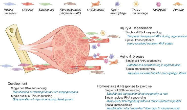 单细胞与单核测序技术揭示了骨骼肌中肌核、卫星细胞、FAPs等群体的惊人异质性及其在发育、再生与衰老中的动态演变;空间多组学则进一步将这些细胞状态定位至神经肌肉接头等特定微环境,并鉴定出新型肌纤维亚型(如IIb mito-high),共同为理解肌肉生理与病理机制提供了前所未有的高分辨率图谱。