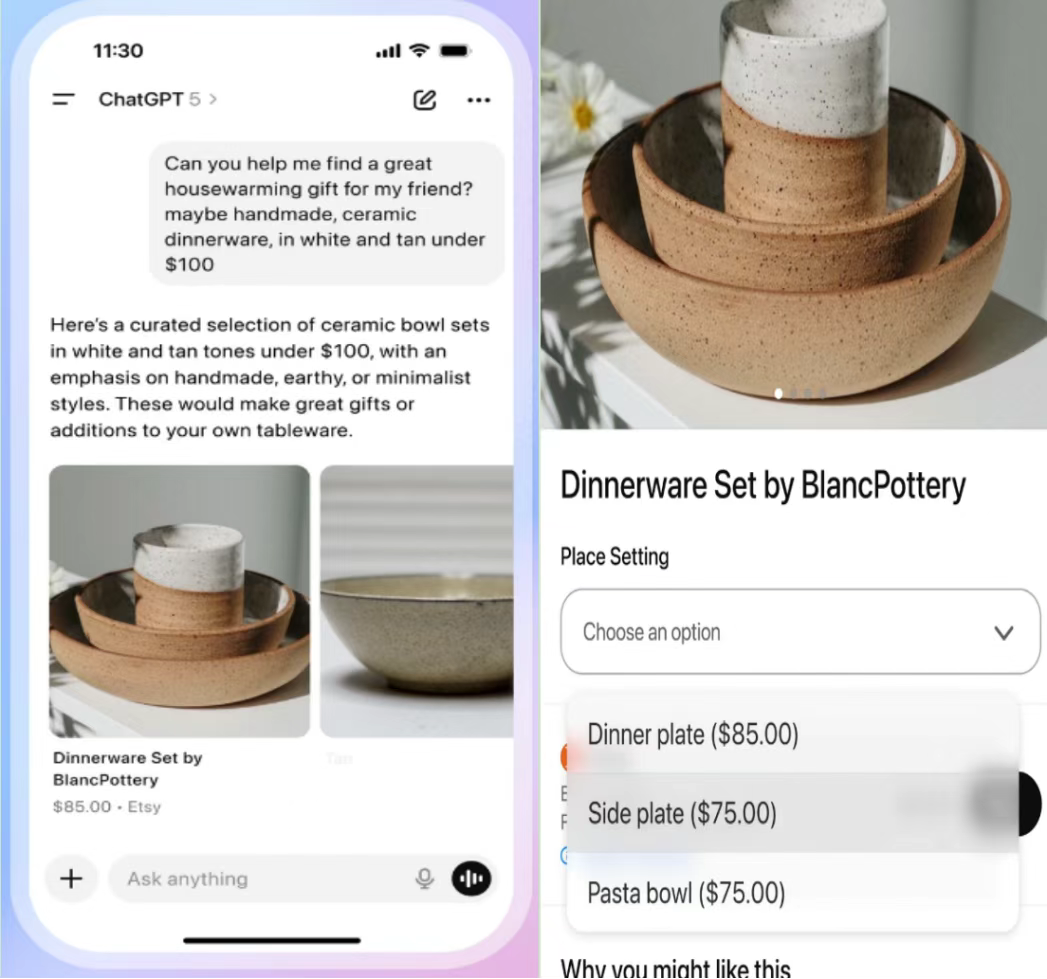 TT123获悉,9月29日,ChatGPT正式推出“即时结账”(Instant Checkout)功能,并宣布率先接入Etsy与Shopify两大电商平台。