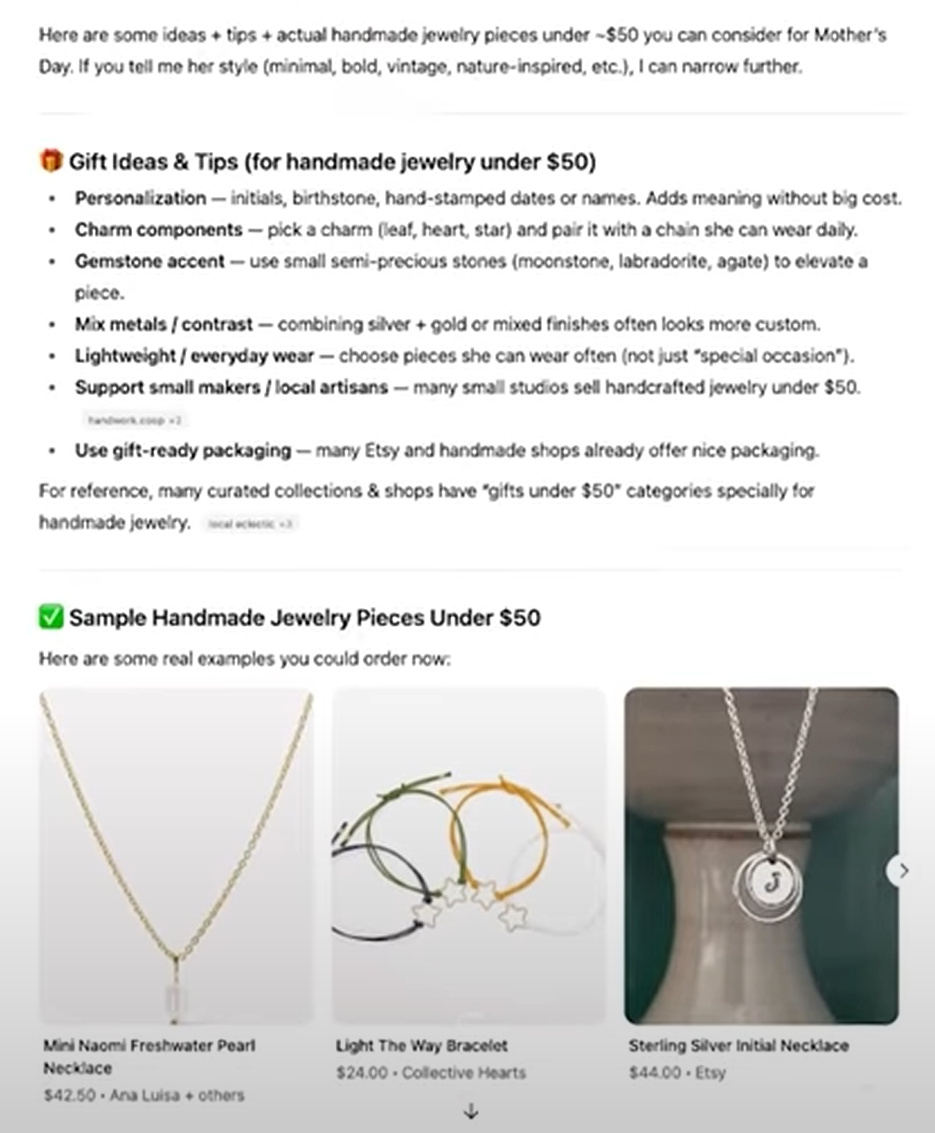 图源:互联网(*在ChatGPT中输入价格低于50美元的、适合母亲节送礼的手工珠宝所生成的购买推荐)