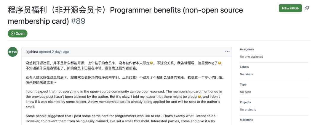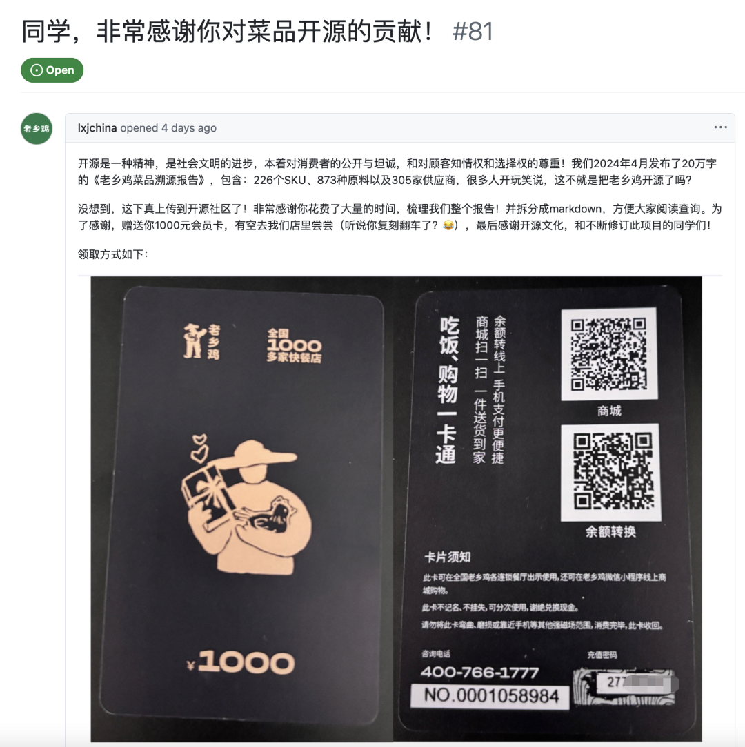 不过本次事件最好笑的还是老乡鸡官方为了表示感谢,给作者赠送了 1000 元代金券,并发在了项目的 Issue 里(狗头)。卡密直接开源。可想而知,作者并没能吃上这顿老乡鸡。