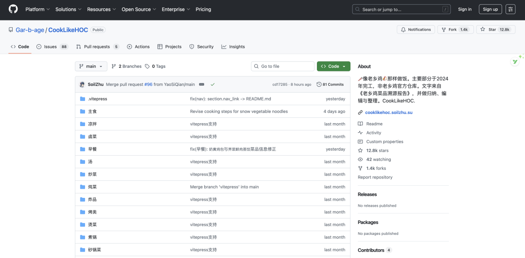 老乡鸡菜谱在 GitHub 上又火了一把,现在已经 12.8k+ 的 Star 了。