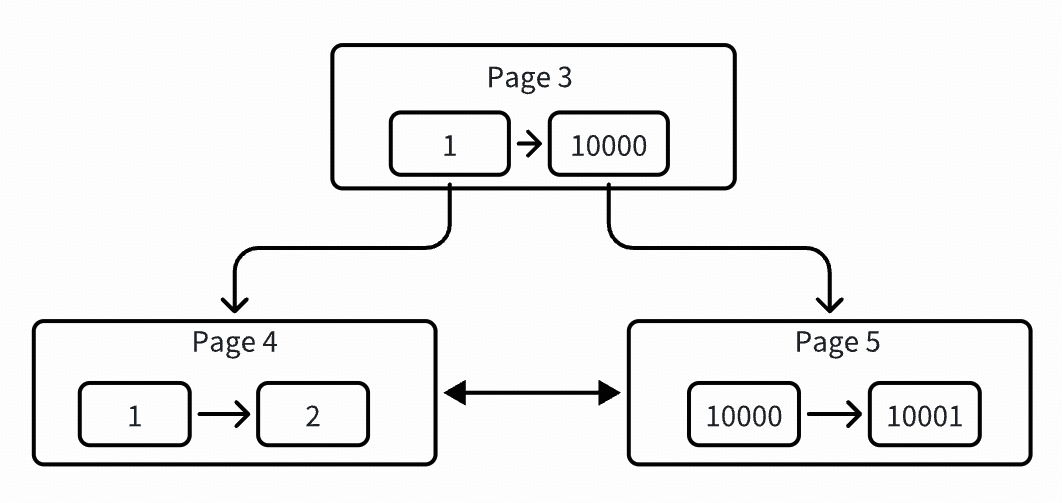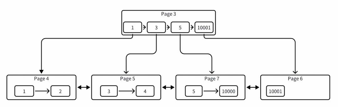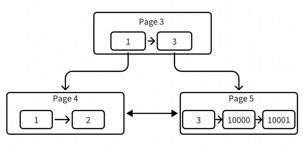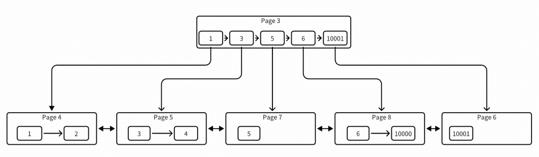 可以看到开始分裂了,page 3 被提升为根节点了,同时分裂出两个叶子节点,各自存了两条数据。此时已经形成了一棵 2 层高的树,还是用图表示吧,比较直观,如下: