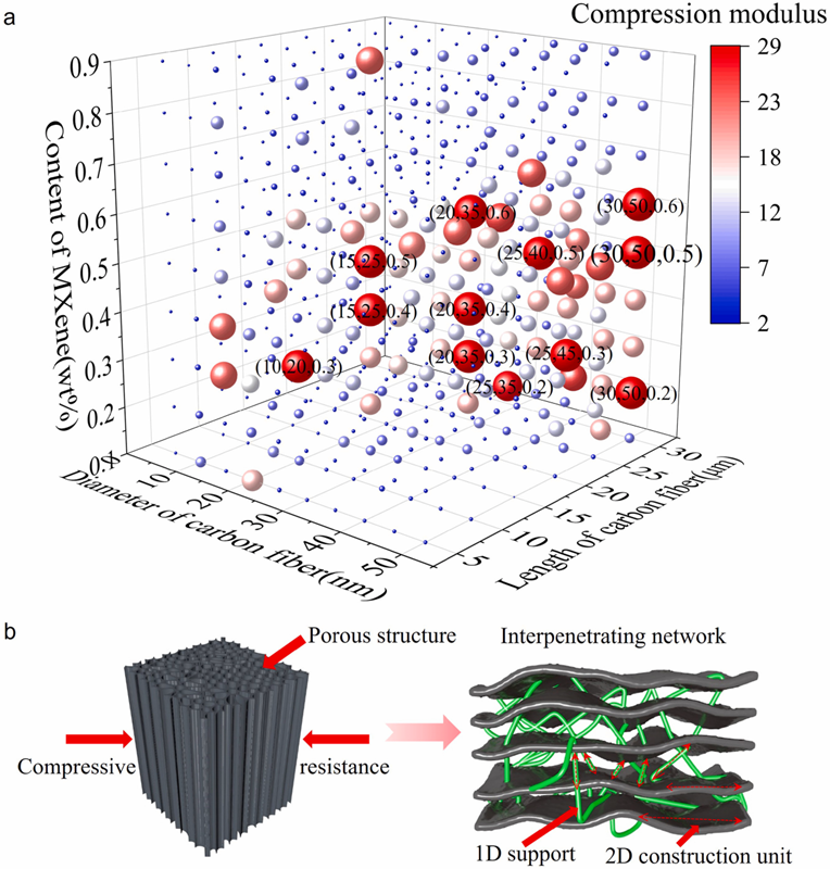 二维过渡金属碳化物(MXene)与纳米纤维素复合气凝胶因其独特的压缩力学性能而显示出巨大的应用潜力。然而,复合气凝胶的压缩力学性能对其结构单元的物理参数敏感,实验研究只能专注于少数输入变量的影响,难以通过高通量实验来优化这些参数。