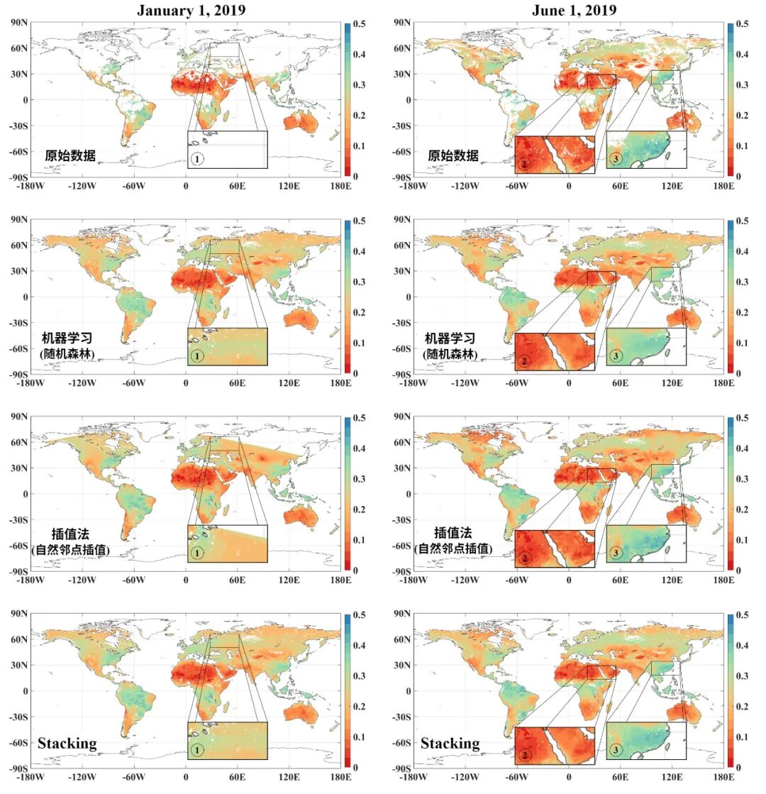 构建好Stacking框架后,研究团队同样使用2018年数据建立模型,对2019年的ESA CCI土壤水分产品进行了填补。图4展示了2019年1月1日和6月1日不同方法填补前后的全球土壤水分分布图。区域①显示当原始数据连续大量缺失时,插值法填补结果出现明显误差,甚至无法填补。区域②和区域③显示在土壤水分低值和高值地区,机器学习填补结果会趋于“平均化”,从而弱化土壤水分的细节特征。Stacking填补结合了两者的优势,既融合了机器学习在大尺度填补的表现,又通过插值法改善了局部区域的细节特征。