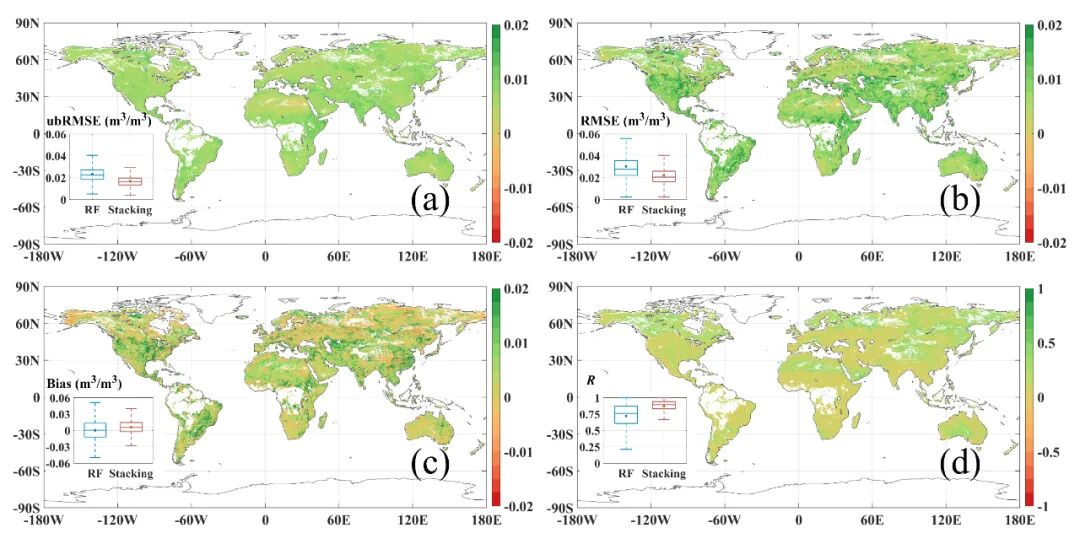 协同了机器学习和插值法的Stacking填补方法在全球整体精度指标(以2019年全球原始未缺失ESA CCI数据为参考)上也得到了大幅提升,其ubRMSE为0.017 m3/m3,RMSE为0.022 m3/m3,Bias为0.006 m3/m3,R为0.87。相对表现最好的单一填补方法随机森林,其RMSE降低了0.009 m3/m3,ubRMSE降低了0.006 m3/m3,相关系数提高了0.15。精度差异全球分布图(图5)显示,所有的误差指标中,Stacking的填补结果在全球绝大部分区域均优于随机森林。