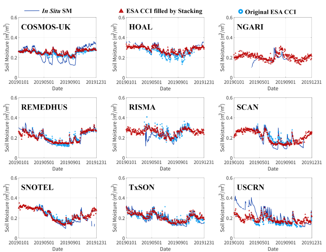 研究团队使用来自全球覆盖不同地表的1086个站点的实测土壤水分数据对原始ESA CCI产品、再分析ERA5产品、以及不同方法填补后的ESA CCI产品进行精度对比。