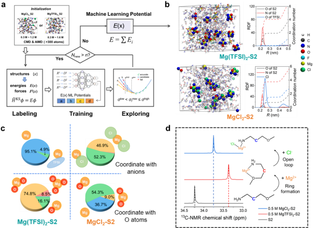 下图展示了通过机器学习方法对DFT计算结果进行采样,并通过并发学习策略主动探索电解液势能面上未学习到的结构,仅用少量(数千个)静态DFT计算的结果即可训练出能覆盖电解液势能面的机器学习势函数,从而进行具有AIMD精度和CMD速度的模拟。