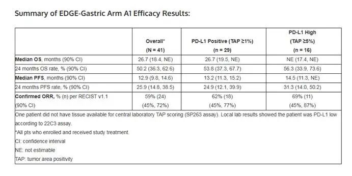 10月12日,Arcus Biosciences与合作伙伴吉利德联合宣布,II期EDGE-Gastric研究Arm A1在局部晚期不可切除或转移性胃、胃食管结合部及食管腺癌患者中取得的首批总生存数据令人鼓舞。截至2025年3月3日数据截止,中位随访26.4个月,41例入组并接受治疗患者的中位总生存期(mOS)达到26.7个月,两年生存率为50%。该结果将在2025 ESMO年会口头报告专场公布(摘要编号:2112MO)。