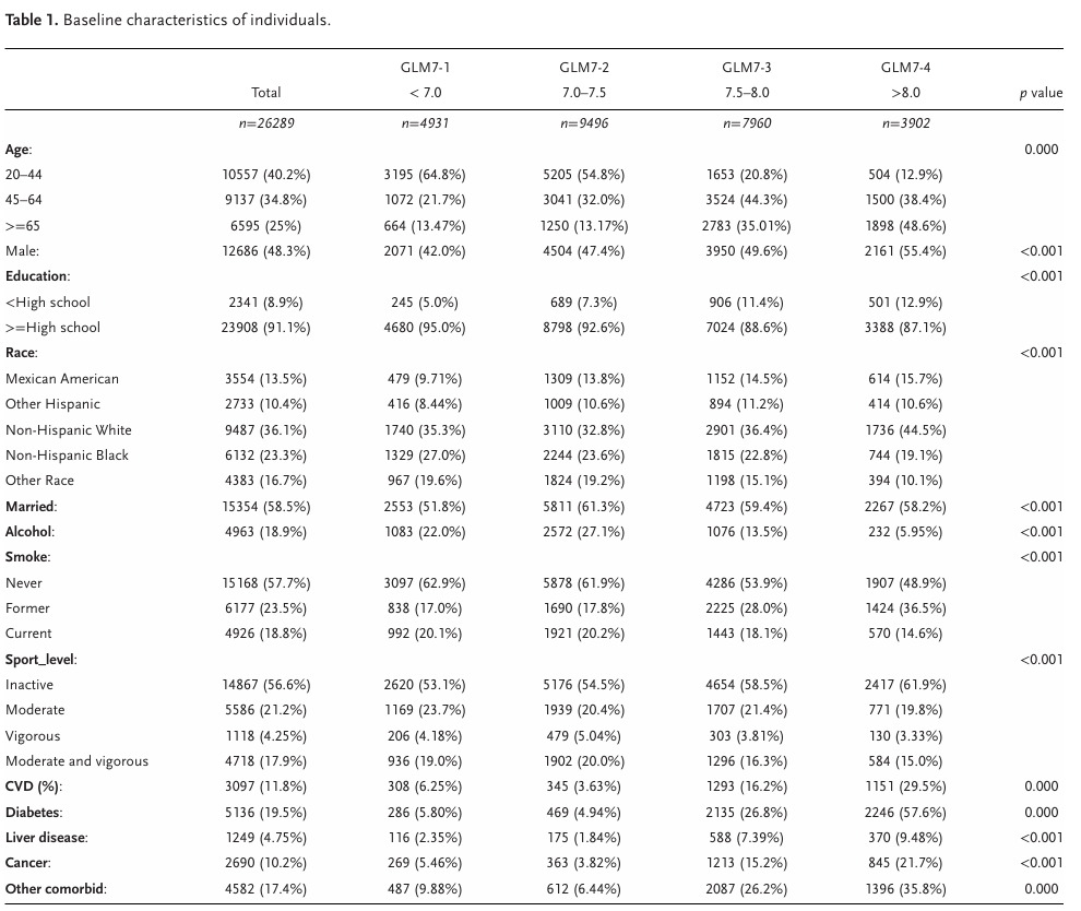 <7.0低危;7.0–7.5中危;≥7.5高危;≥65岁人群同等GLM7水平风险更高,性别差异不显著。