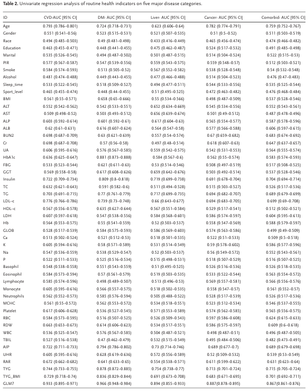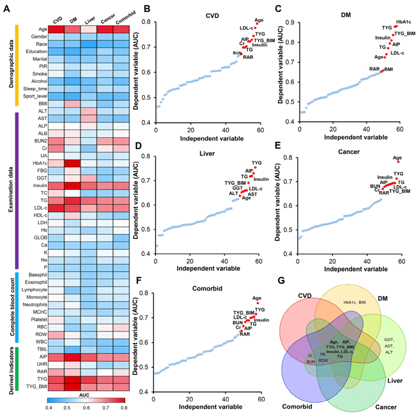 年龄、TyG、TyG_BMI、AIP、胰岛素、LDL-c、TG等7项在所有疾病中AUC均>0.70,为后续建模核心变量。