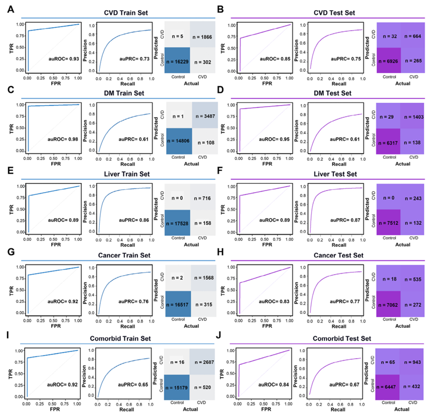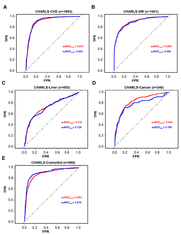 CHARLS外部验证:AUROC CVD 0.92、DM 0.90、肝病0.73、癌症0.79、共病0.92,显示跨种族稳健性。