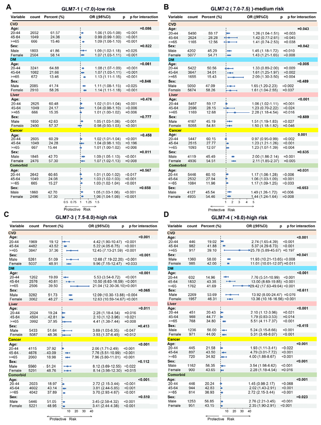 CVD、DM、肝病、癌症、共病的风险阈值分别约为7.7、7.9、7.8、7.5、7.6;GLM7>7.5后风险陡升。