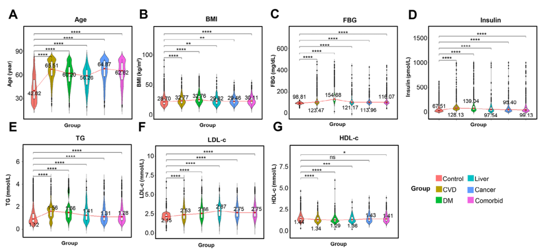 GLM7在五类疾病中的AUROC均显著高于传统指数(DeLong检验p<0.01),证明GLM7相对于TyG、TyG_BMI、AIP的增量价值。