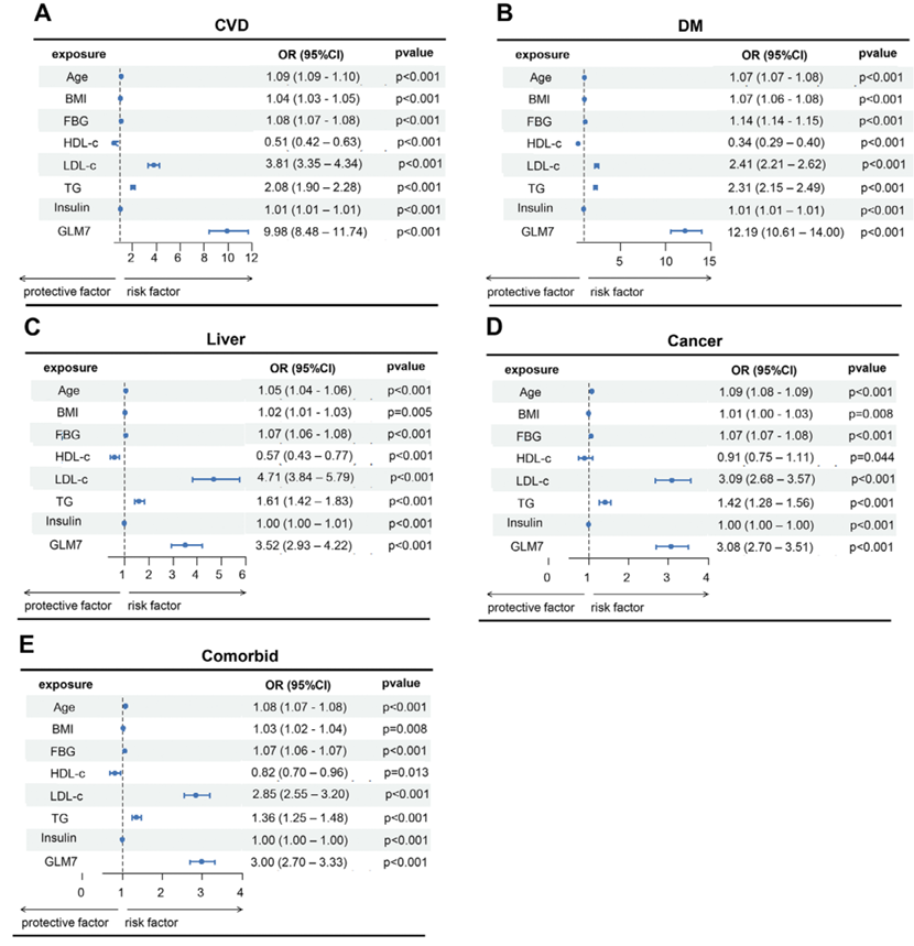 GLM7与五类疾病均显著相关,OR 3.0–12.2,AUROC 0.87–0.97,优于TyG、AIP等现有指数。