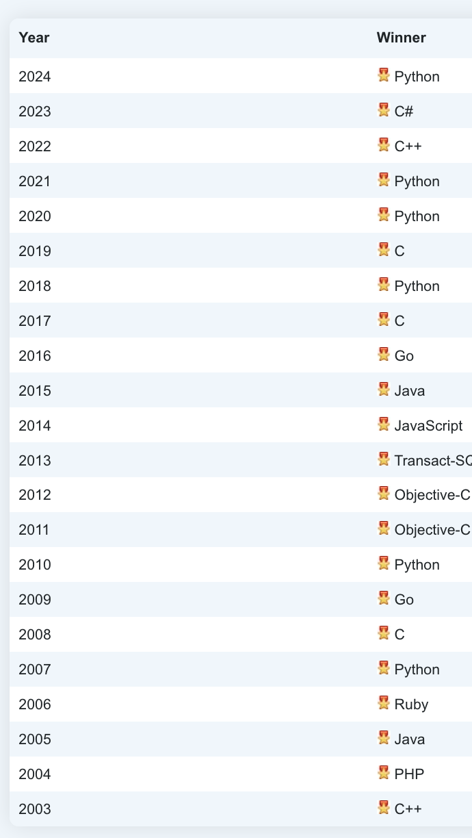 Python,C,C++,Java,C#,JavaScript,Visual Basic,Go,