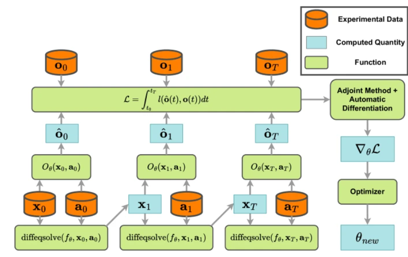 θ 和观测函数 Oθ 定义,进行前向模拟生成预测数据,并与实验观测值对比计算损失。借助 diffrax 和 JAX 的自动微分伴随方法,从而优化模型参数。