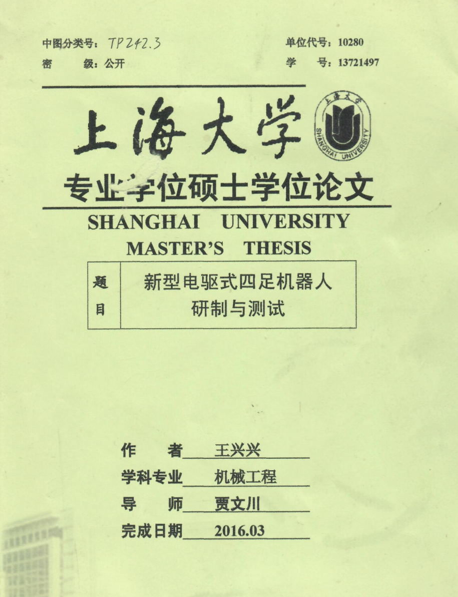 这篇论文完成于2016年,题目为《新型电驱式四足机器人研制与测试》。
