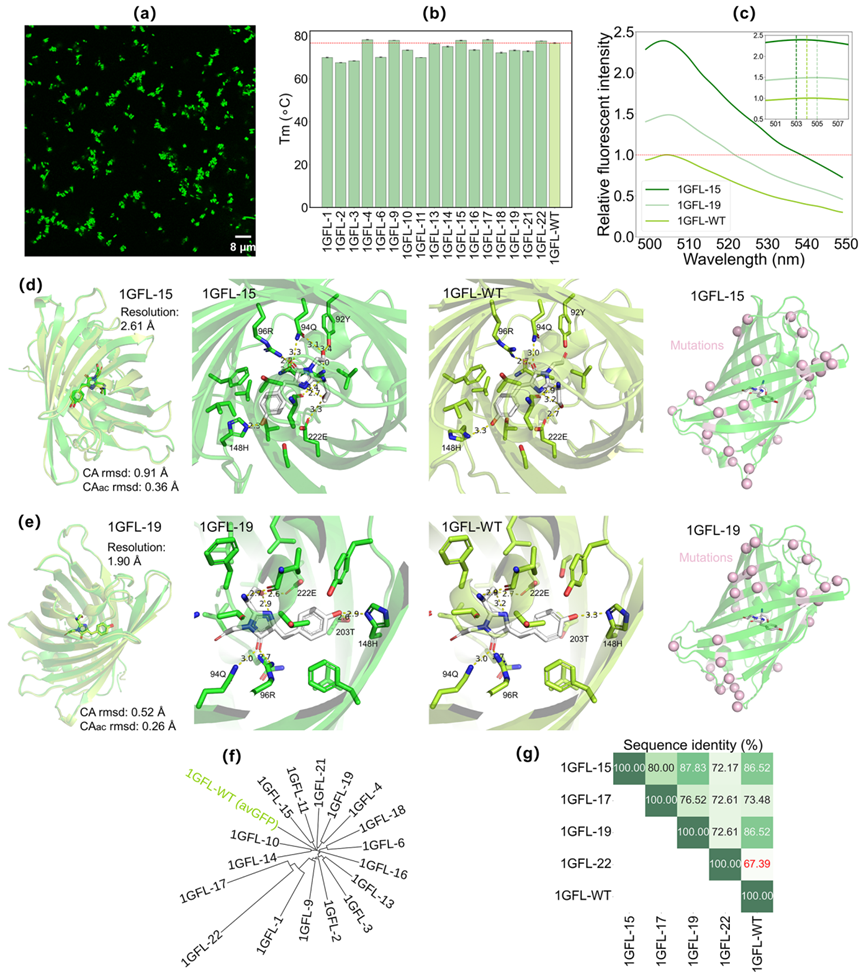 图4 基于靶标GFP设计序列的实验结果。(a)活E.coli的荧光图像;(b)通过荧光变化测定设计蛋白与野生型GFP的热稳定性;(c)在470nm激发下,比较设计蛋白与野生型GFP的荧光强度;(d)、(e)从左到右依次为:设计蛋白与野生型GFP晶体结构的叠合、发色团的微环境细节图以及突变分布情况;(f)设计序列的系统进化树分析;(g)与野生型差异较大的多个设计序列的序列多样性矩阵。