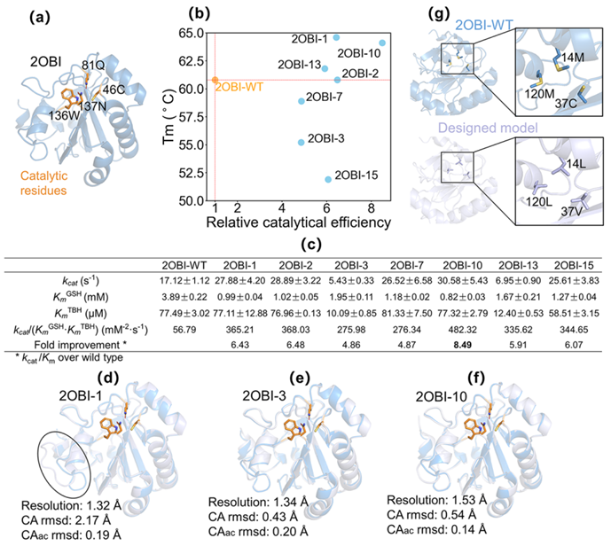 图5 基于靶标GPX4设计序列的实验结果。(a)用于序列设计的结构模板;(b)催化活性与Tm的关系;(c) 设计的活性蛋白与野生型的动力学参数;(d)、(e)、(f)为三种设计蛋白与野生型晶体结构的叠合图;(g) 野生型与三种设计蛋白核心区域的比较。
