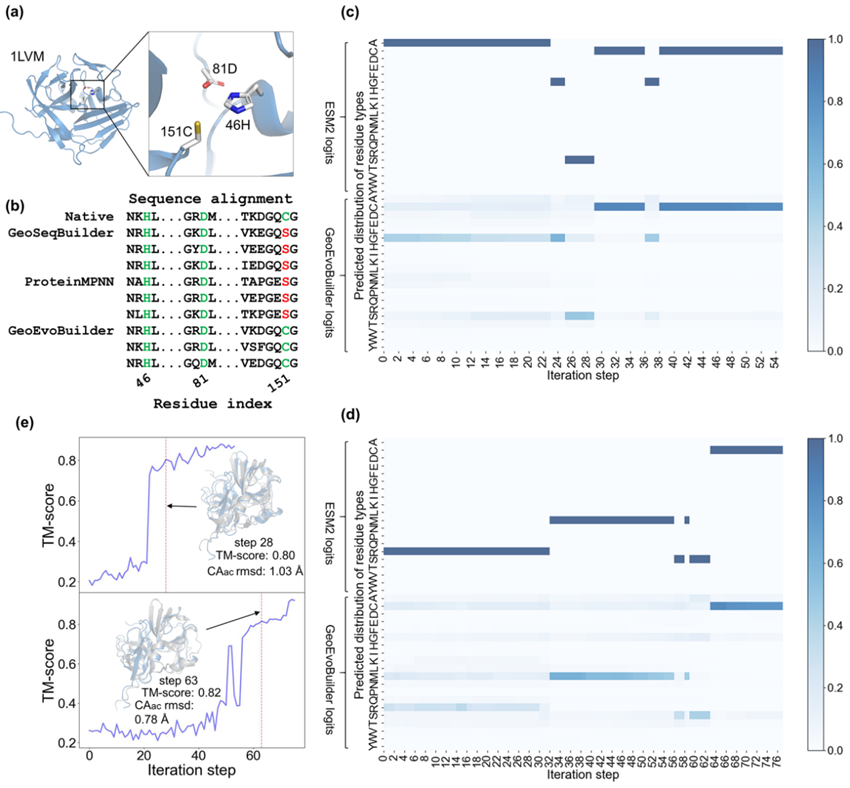 图3 GeoEvoBuilder学到了恢复功能位点的能力。(a)TEV蛋白酶的催化位点;(b)GeoEvoBuilder能在最终序列中成功恢复催化残基151C,而GeoSeqBuilder和ProteinMPNN未能做到;(c)与(d)分别展示在50%天然序列被掩蔽和随机初始化条件下,GeoEvoBuilder恢复151C的过程。(e)中分别给出了(c)和(d)对应中间序列预测结构的TM-score变化。