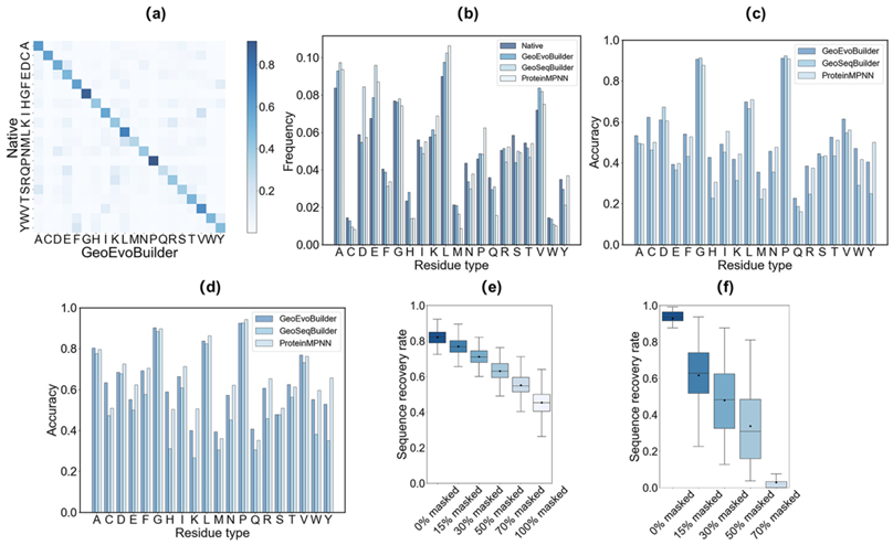 图2 序列恢复率结果。(a)混淆矩阵;(b)残基分布及比较;(c)loop区域预测精度;(d)埋藏区域预测精度;不同起始条件下GeoEvoBuilder的序列恢复率(e)和ESM2的序列恢复率(f).