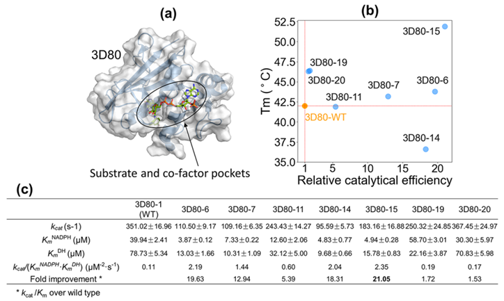 图6 基于靶标DHFR设计序列的实验结果。(a)用于DHFR设计的结构模板;(b)设计蛋白的Tm(熔解温度)与催化活性分布;(c)设计蛋白与野生型DHFR的动力学参数。