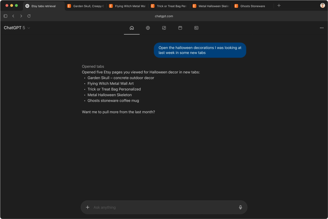 输入「重新打开我昨天看过的那些鞋子」或「整理一下标签页」,剩下的就放心交给ChatGPT吧。