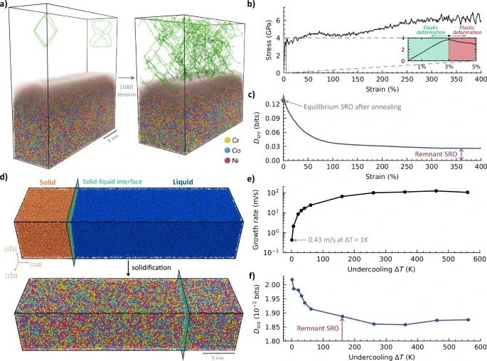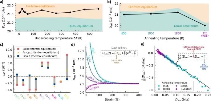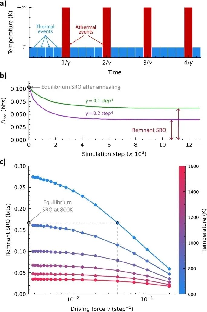 即使在快速变形或高温冷却中,金属仍会呈现独特的化学模式——既不同于平衡态的晶格,也不同于完全无序的混合体。研究团队称之为「远离平衡的 SRO」,并首次建立了一个能够量化这一现象的统计模型。