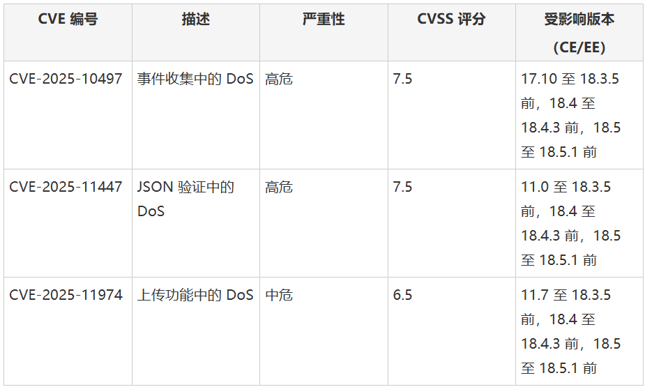 最紧迫的修复包括三个高危或中危 DoS 漏洞,远程攻击者无需认证即可使 GitLab 实例崩溃:CVE-2025-10497:针对事件收集功能,未认证用户可发送特制负载触发资源耗尽和服务拒绝。影响 17.10 至补丁发布前的 CE/EE 版本,CVSS 评分为 7.5,复杂度低但可用性影响高。CVE-2025-11447:利用 GraphQL 请求中的 JSON 验证漏洞,从 11.0 版本开始,未认证攻击者可向系统发送恶意负载。该漏洞 CVSS 评分同样为 7.5,影响广泛安装并可能中断 API 响应。CVE-2025-11974(中危):在向特定 API 端点上传文件时,未认证来源的大文件会消耗过多资源。影响 11.7 及以上版本,CVSS 评分为 6.5,某些场景下需要低权限访问。