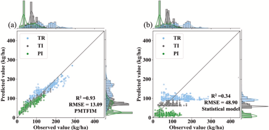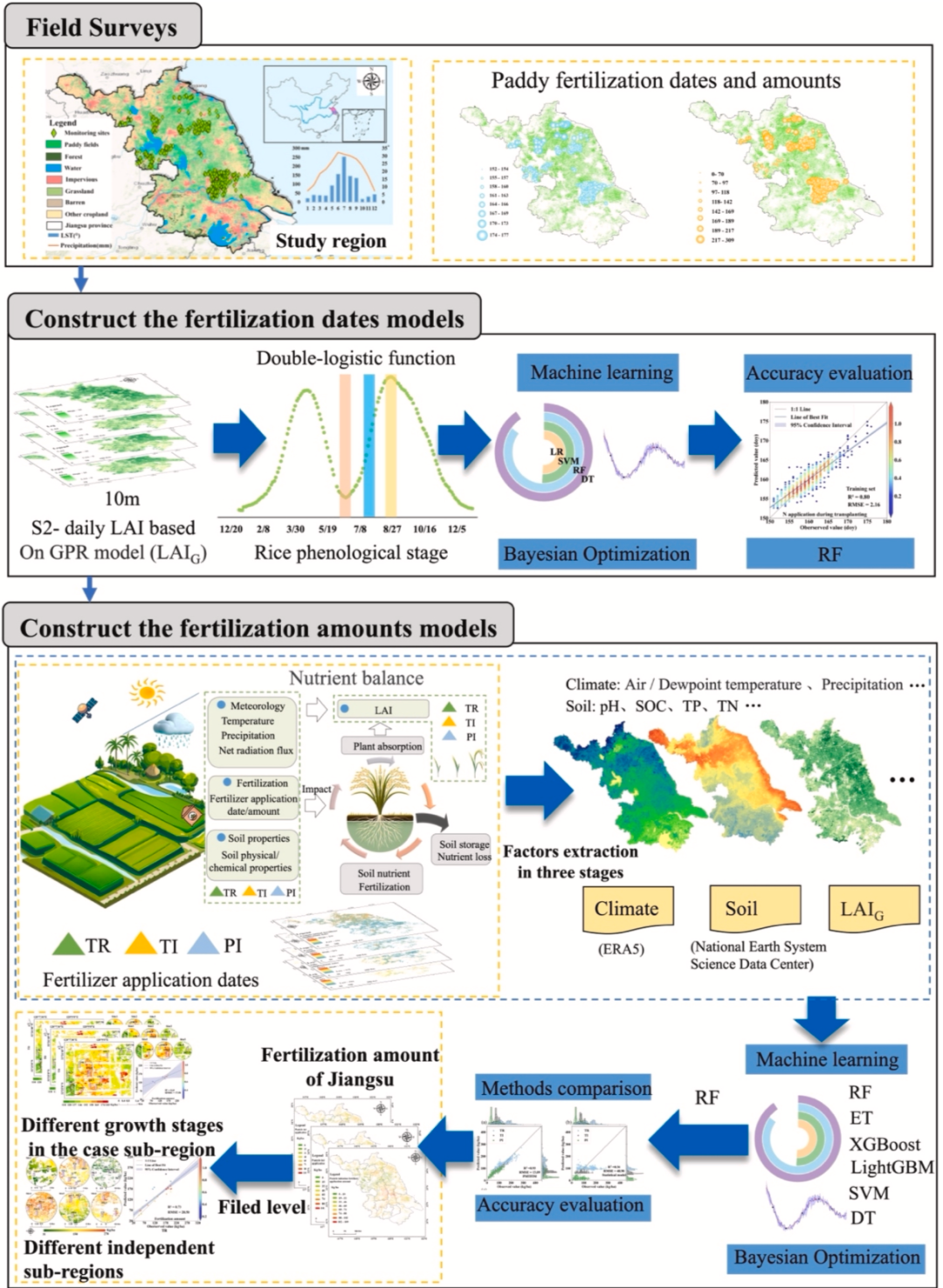 准确估算大面积区域多阶段田间水稻施肥信息,为优化施肥管理以及评估温室气体排放和农业面源污染风险提供了关键支持。大多数现有模型利用政府统计机构或国际数据库(如联合国粮食及农业组织统计数据库)的调查数据来估算年度施肥信息,忽略了作物生长季内不同物候生长阶段的施肥情况。尽管一些研究基于遥感利用叶面积指数(LAI)来估算多阶段施肥信息,但它们采用的是统计模型,导致显著的不确定性。在本研究中,我们提出了一个精确追踪多阶段水稻施肥信息模型(PMTFIM),这是一个新颖的遥感驱动框架,它整合了基于高斯过程回归的LAI时间序列、物候建模以及结合养分平衡理论的机器学习方法,以估算分散农业区域田间尺度的多阶段水稻施肥信息。首先,我们使用高斯过程回归方法获得了每日10米分辨率的LAI数据集,然后整合双逻辑函数生成训练物候数据。因此,我们通过耦合最优机器学习模型基于水稻物候估算施肥日期。施肥量模型通过使用最优机器学习开发,该模型基于养分平衡考虑了施肥、气象条件、土壤性质和LAI动态之间的相互作用。我们确定随机森林模型是多个机器学习模型中的最优模型。结果表明,PMTFIM捕捉到了分散稻田施肥信息的异质性。与现有统计模型相比,基于训练和测试数据集的总体预测精度有所提高(日期:R2>0.95,均方根误差<5天;施肥量:R2>0.80,均方根误差<14千克/公顷)。在测试数据集上评估的田间尺度和独立子区域,PMTFIM在多个生长阶段实现了可靠的精度,施肥日期和施肥量的R2范围为0.53 - 0.80,同时在整个生长季保持了较高的总体精度,R2为0.80 - 0.96。我们提出的方法在估算大面积区域田间尺度作物多阶段施肥信息方面具有巨大潜力,特别是在田块分散的地区。