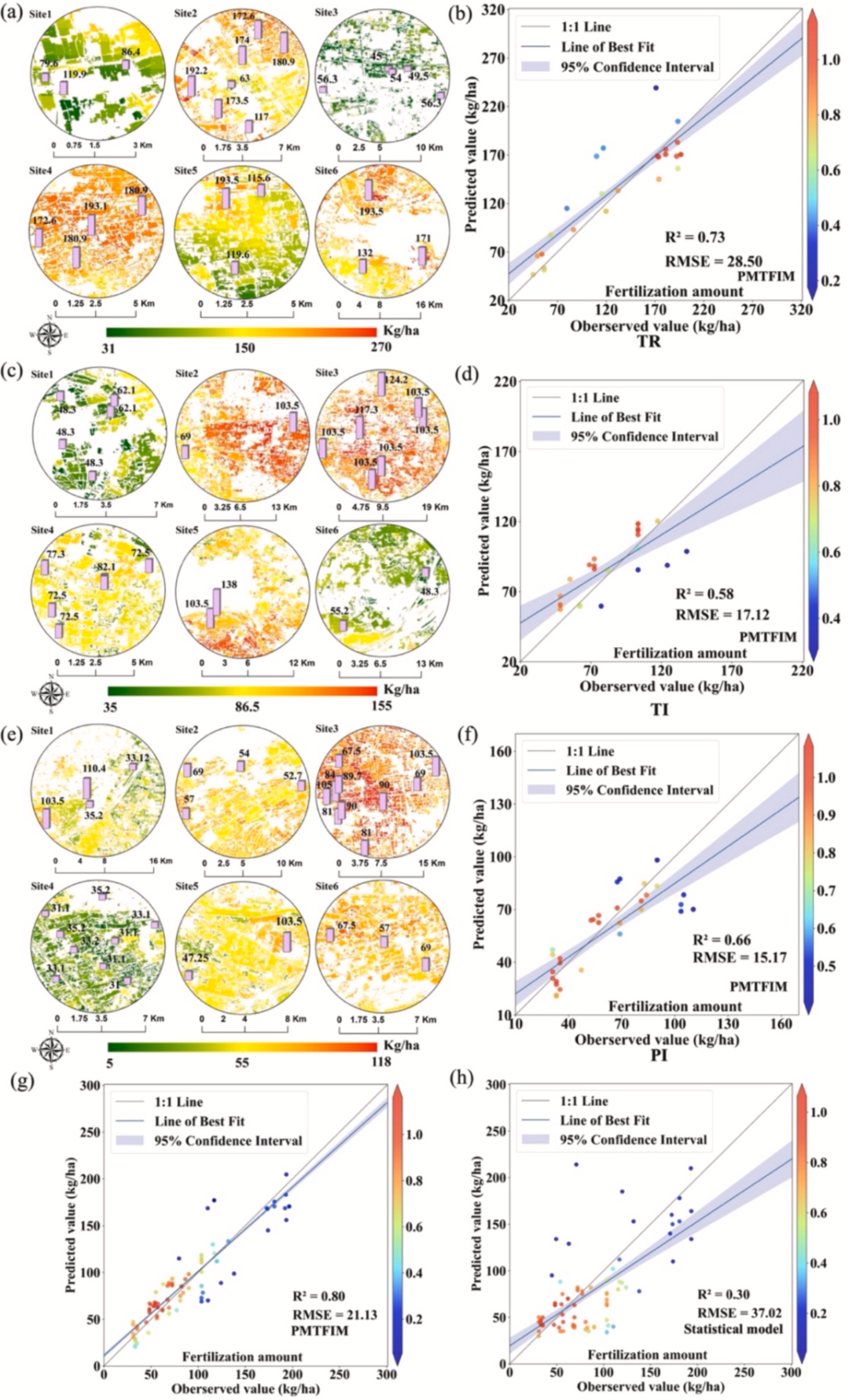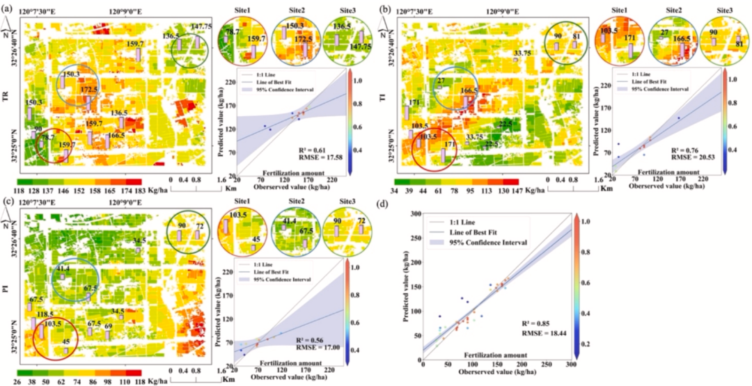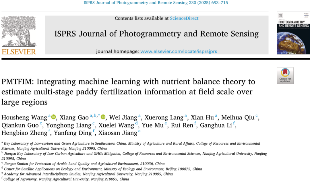 图11. 基于稻田多阶段施肥预测模型(PMTFIM)的不同独立子区域水稻基肥(a)、分蘖肥(c)、孕穗肥(e)施氮日期图;各阶段的验证结果通过测试数据集获得,分别显示于(b)、(d)、(f)中。(g)为该子区域内稻田多阶段施肥预测模型(PMTFIM)的整体验证结果,(h)为该子区域内统计模型的整体验证结果。图12.田间尺度稻田基肥(TR)、分蘖肥(TI)、孕穗肥(PI)施肥日期模拟图。(d)为该子区域内稻田多阶段施肥预测模型(PMTFIM)的整体验证结果。其中,站点 1(Site1)、站点 2(Site2)、站点 3(Site3)分别用红色、蓝色和绿色表示。图13. 不同机器学习算法的稻田施肥量预测精度。(a)基肥施肥量、(b)分蘖肥施肥量、(c)孕穗肥施肥量的模型筛选。图14. 随机森林模型下多阶段施肥量在训练集与测试集上的实测值与预测值对比。(a)、(c)、(e)分别为基肥、分蘖肥、孕穗肥施肥量在训练集上的结果;(b)、(d)、(f)为对应在测试集上的结果。图15. 稻田多阶段施肥预测模型(PMTFIM)(a)与统计模型(b)的稻田施肥量估算值与观测值验证。其中,移栽期施肥(TR)、分蘖期施肥(TI)和孕穗期施肥(PI)分别用蓝色、灰色和绿色表示。图16. 江苏省水稻基肥、分蘖肥、孕穗肥施氮量的模拟图(a、c、e)与观测图(b、d、f)。图17.基于稻田多阶段施肥预测模型(PMTFIM)的江苏省水稻基肥、分蘖肥、孕穗肥施氮量图(a、c、e)与基于统计模型的对应施氮量图(b、d、f)。图 18.基于稻田多阶段施肥预测模型(PMTFIM)的不同独立子区域水稻基肥(a)、分蘖肥(c)、孕穗肥(e)施氮量图;各阶段的验证结果通过测试数据集获得,分别显示于(b)、(d)、(f)中。(g)为该子区域内稻田多阶段施肥预测模型(PMTFIM)的整体验证结果,(h)为该子区域内统计模型的整体验证结果。图 19.田间尺度稻田基肥(TR)、分蘖肥(TI)、孕穗肥(PI)施肥量模拟图。(d)为该子区域内稻田多阶段施肥预测模型(PMTFIM)的整体验证结果。其中,站点 1(Site1)、站点 2(Site2)、站点 3(Site3)分别用红色、蓝色和绿色表示。声明:本推文仅用于学习交流,不做其他任何目的。若有侵权,请联系微信号:GeeStudy_2020删除或修改!论文doi链接:https://doi.org/10.1016/j.isprsjprs.2025.10.006,点赞、收藏、关注!后台回复:GEE遥感训练营251023,免费获取原文。