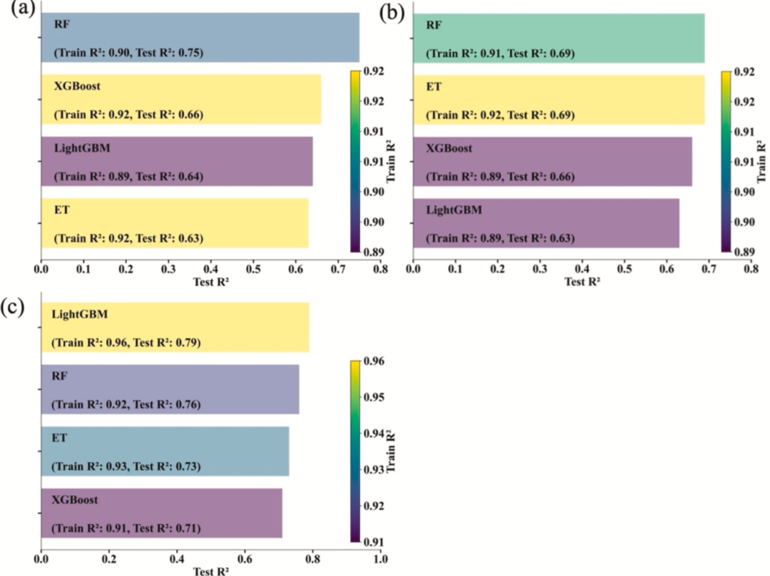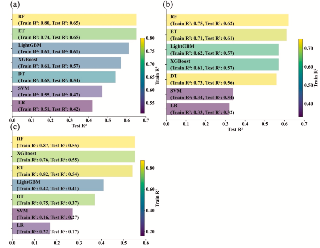图 6.不同机器学习算法的稻田施肥日期预测精度。(a)基肥施肥日期、(b)分蘖肥施肥日期、(c)孕穗肥施肥日期的模型筛选。