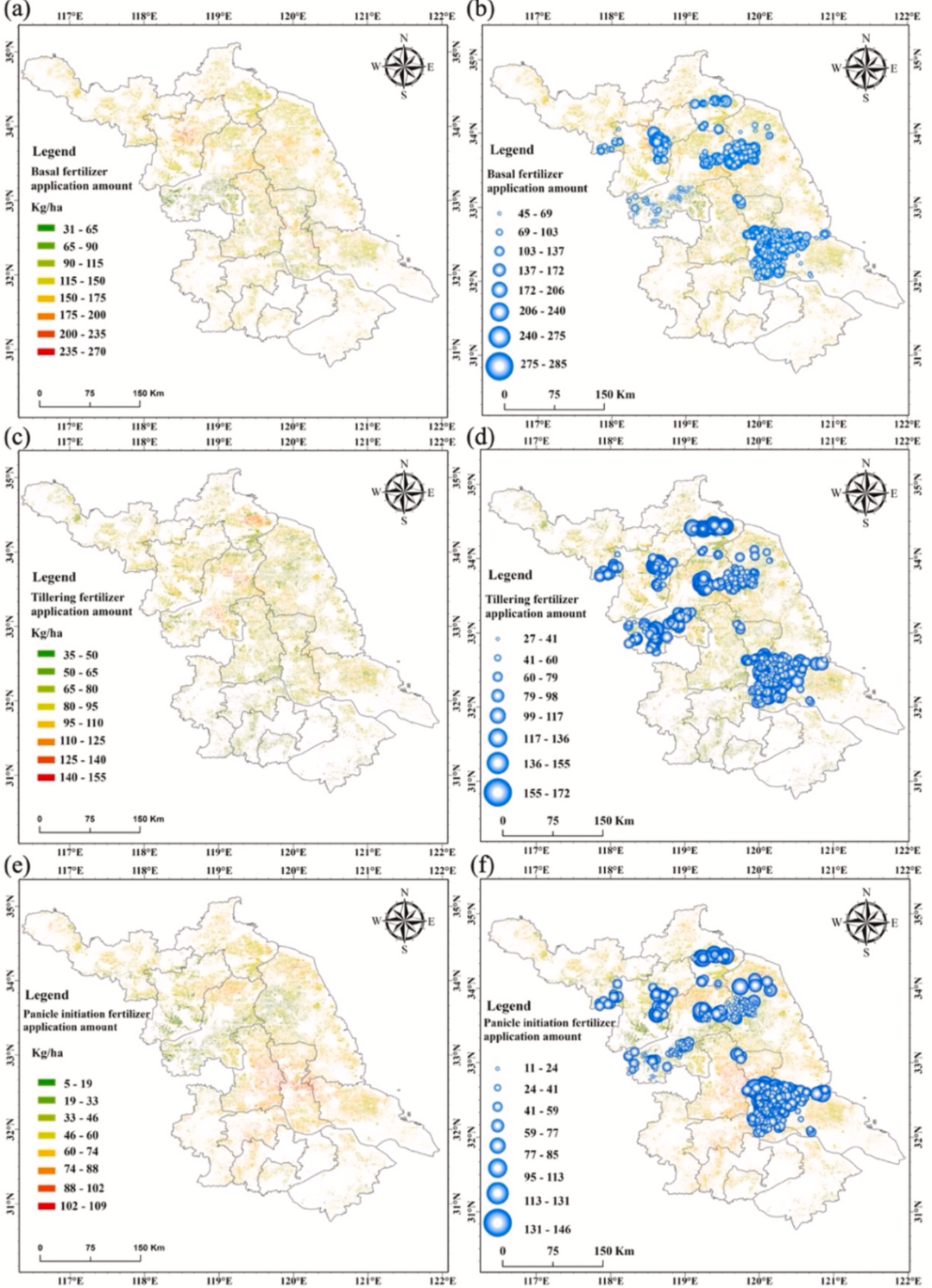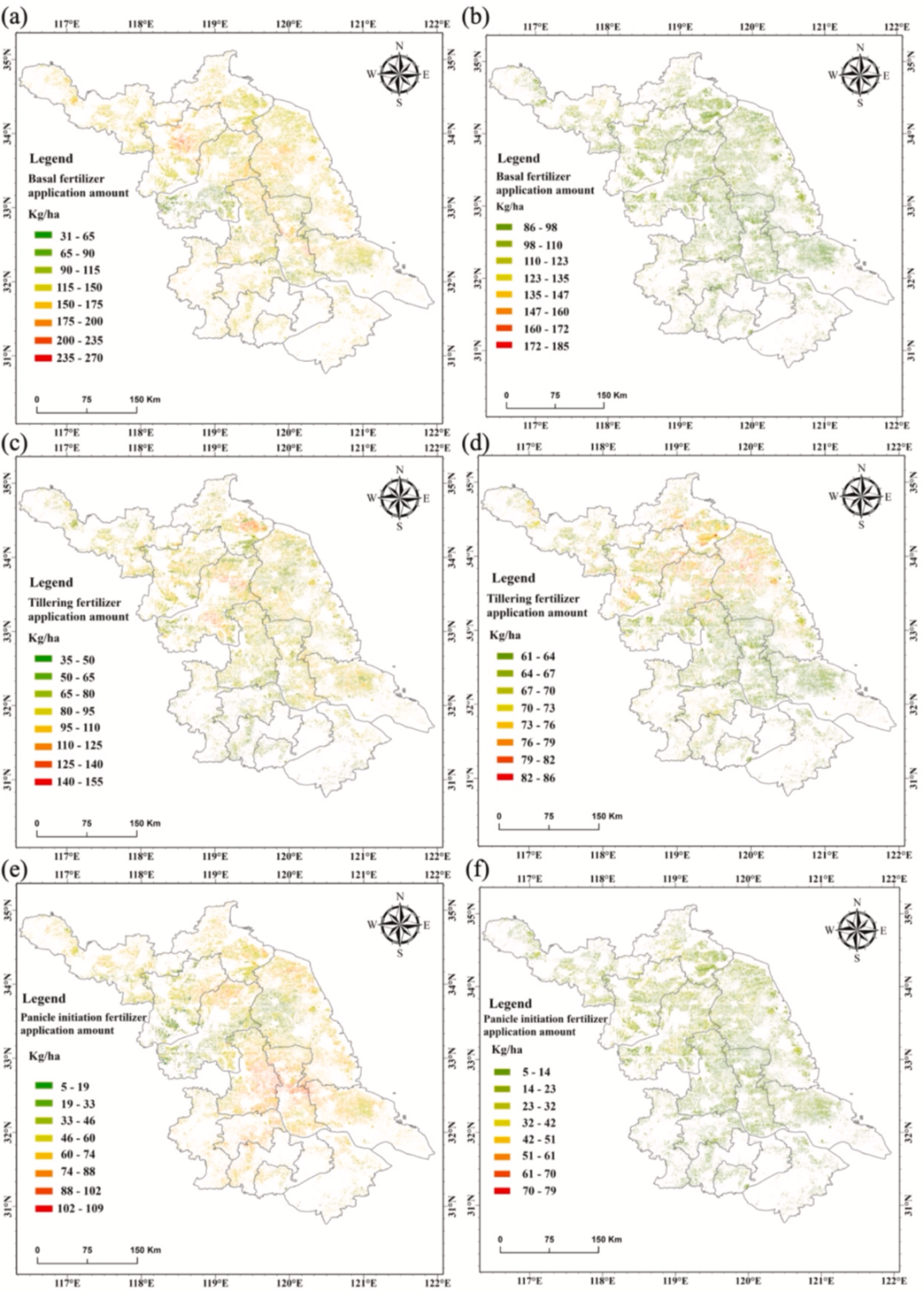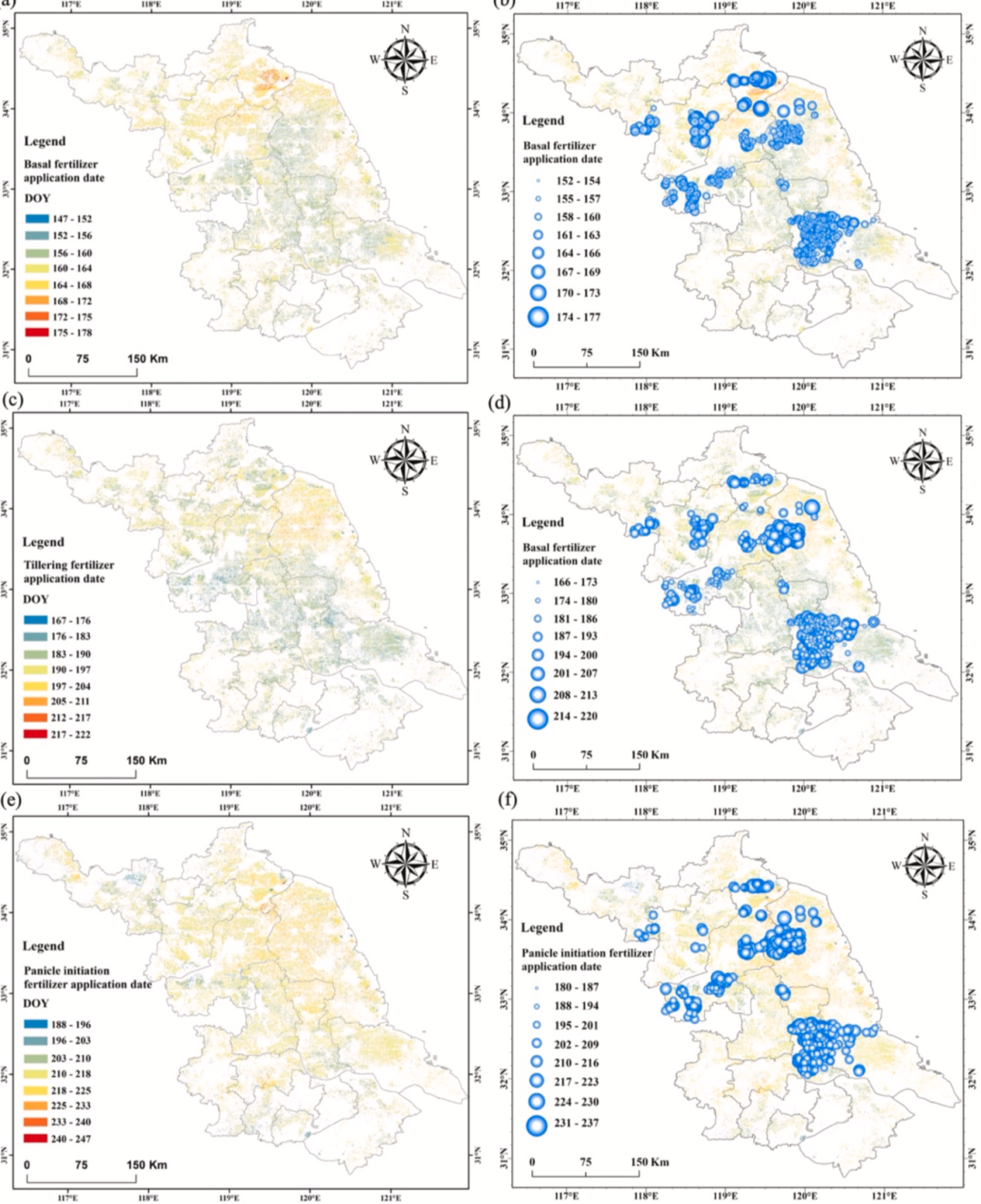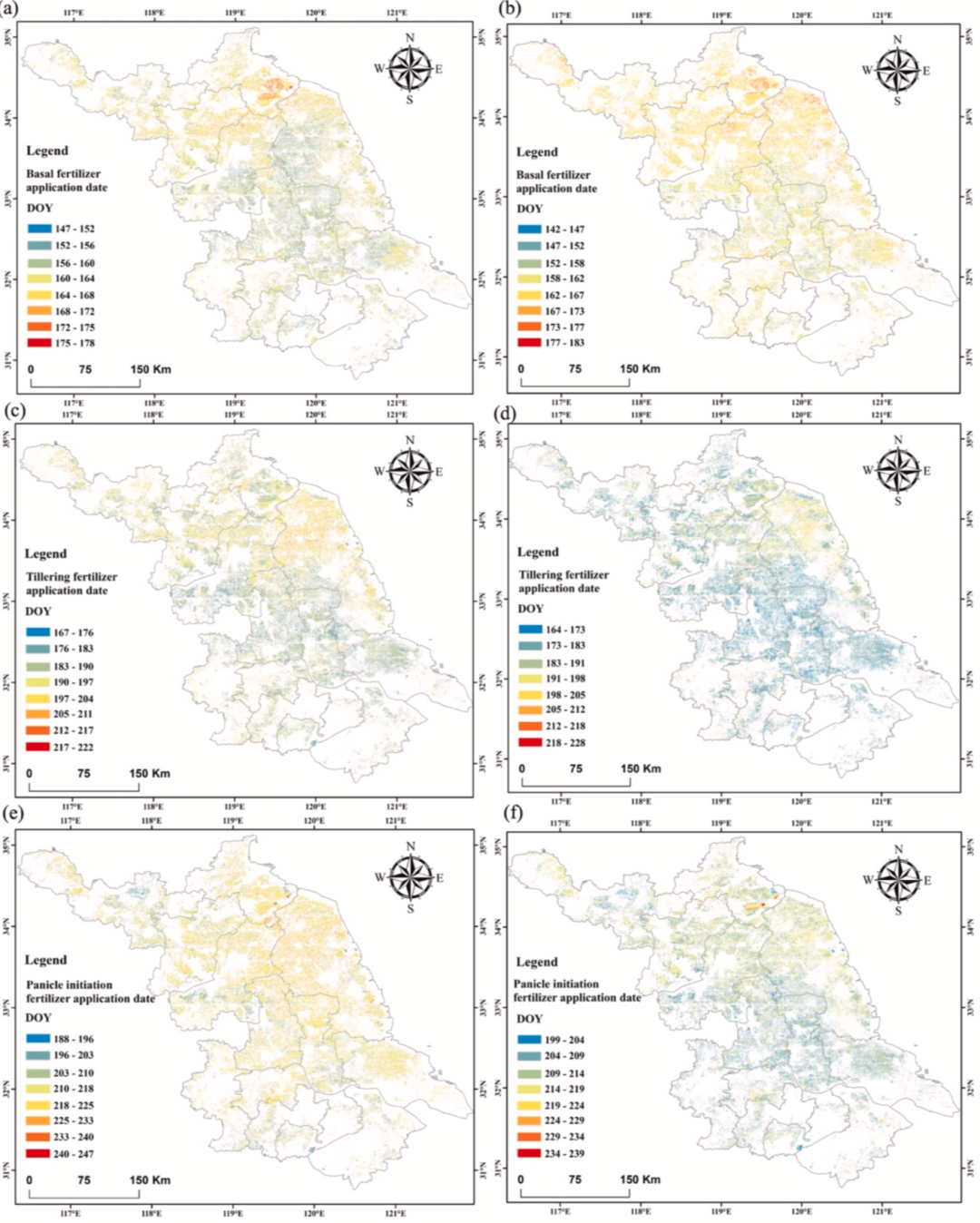 图10. 基于稻田多阶段施肥预测模型(PMTFIM)的江苏省水稻基肥、分蘖肥、孕穗肥施氮日期图(a、c、e)与基于统计模型的对应施氮日期图(b、d、f)。