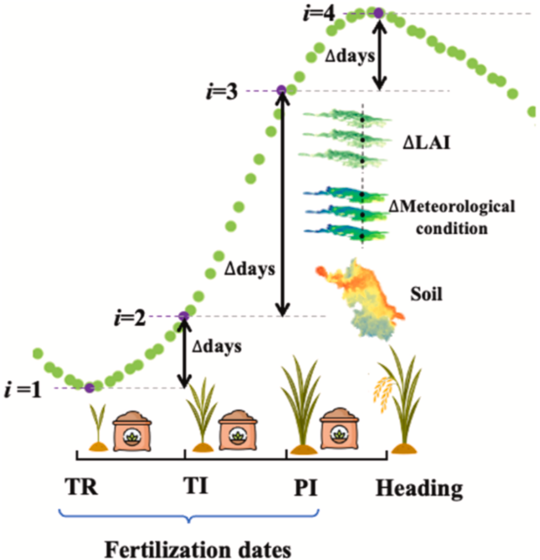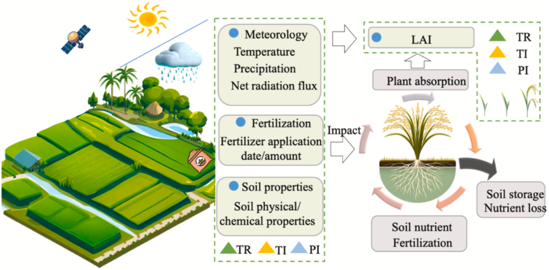 图 2.稻田多阶段施肥预测模型(PMTFIM)理论基础概念图。其中,TR、TI、PI 分别代表移栽期施肥、分蘖期施肥和孕穗期施肥。图 3.田间尺度稻田多阶段施肥日期与施肥量预测模型(PMTFIM)流程图。
